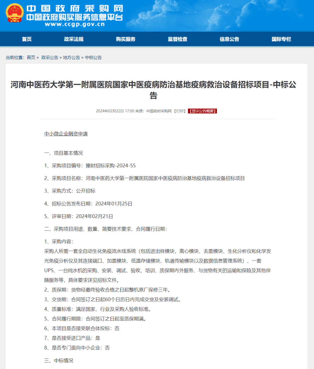 2月22日,中国政府采购网发布了《河南中医药大学第一附属医院国家中医疫病防治基地疫病救治设备招标项目-中标公告》。