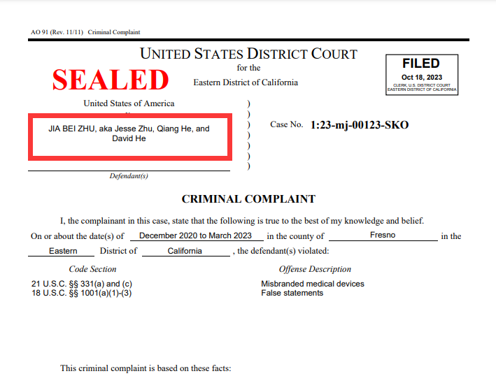据联邦特工称,62岁的中国公民朱佳贝(Jia Bei Zhu,音译),又名Jesse Zhu、Qiang He、David He,于周四被美国食品和药物管理局(FDA)逮捕,被指控分销贴有标签的医疗设备,并向FDA提供虚假陈述。