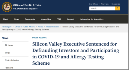 图一,美国司法部官网公开信息,晨同学摘自其官网,文章原题目:硅谷高管因欺诈投资者和参与新冠和过敏测试计划被判刑