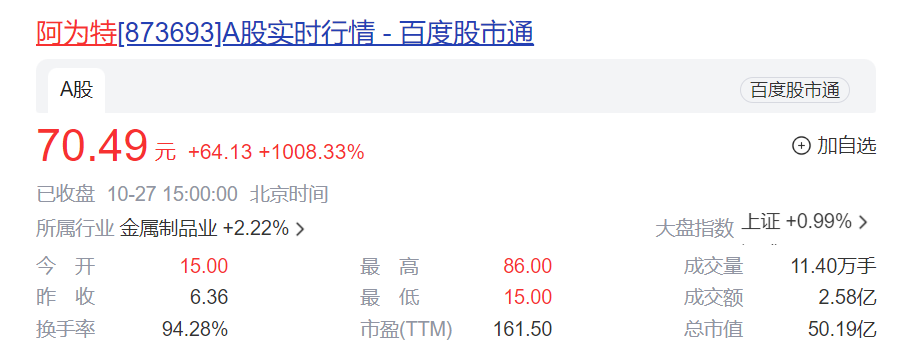 上市首日该股表现极其惊艳:最终报收70.49元,涨幅达到惊人的1008.33%。