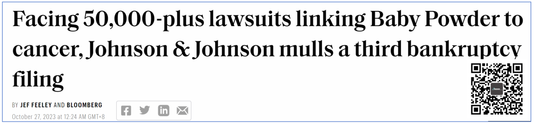 标题是:面临5万多起婴儿爽身粉可能致癌诉讼,强生考虑第三次申请破产保护。