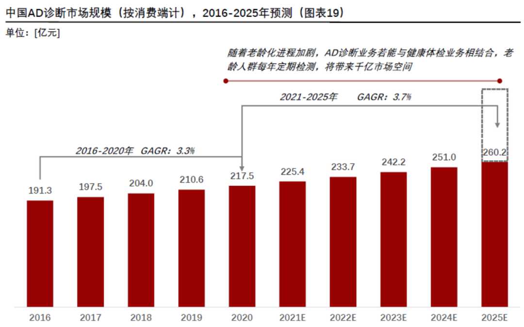 2016年中国AD诊断市场规模约191.3亿元,2020年上升至217.5亿元,年复合增长率为3.3%,预计2025年将增长至260.2亿元,年复合增长率为3.7%。