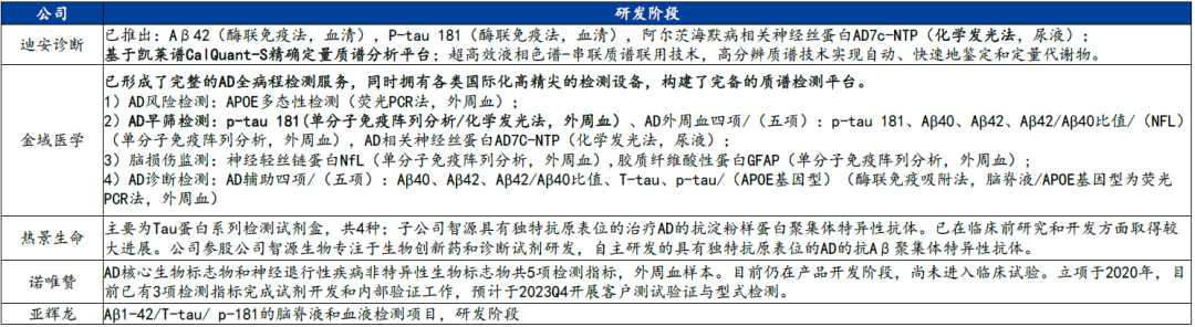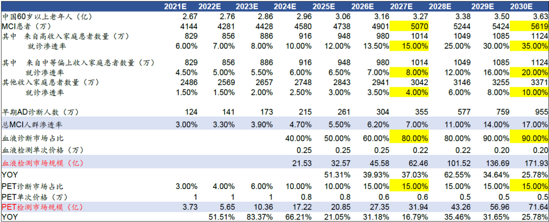 假设2024年出现第三方实验服务的PET/CSF前分流血液检测,2027年国内血液检测产品获批上市,早期AD整体就诊渗透率大幅提升,我们预计,2030年AD的血液检测的市场规模约171.93亿元;受到血液检查的冲击,预计CSF检查可能被完全替代。Tau-PET能预测患者认知能力的下降速度,随着PET价格进一步下降,我们预计PET会成为补充血液检查的主要检查方式,预计2030年PET检测市场规模约71.64亿元。 表 | 预计2030年AD血液检测的市场约171.93亿元,PET检测市场规模约71.64亿元数据来源:国务院,人民网,国家统计局,浙江省医保局,The Lancet Public Health,Current Opinion in Psychiatry,头豹研究院,华福证券研究所