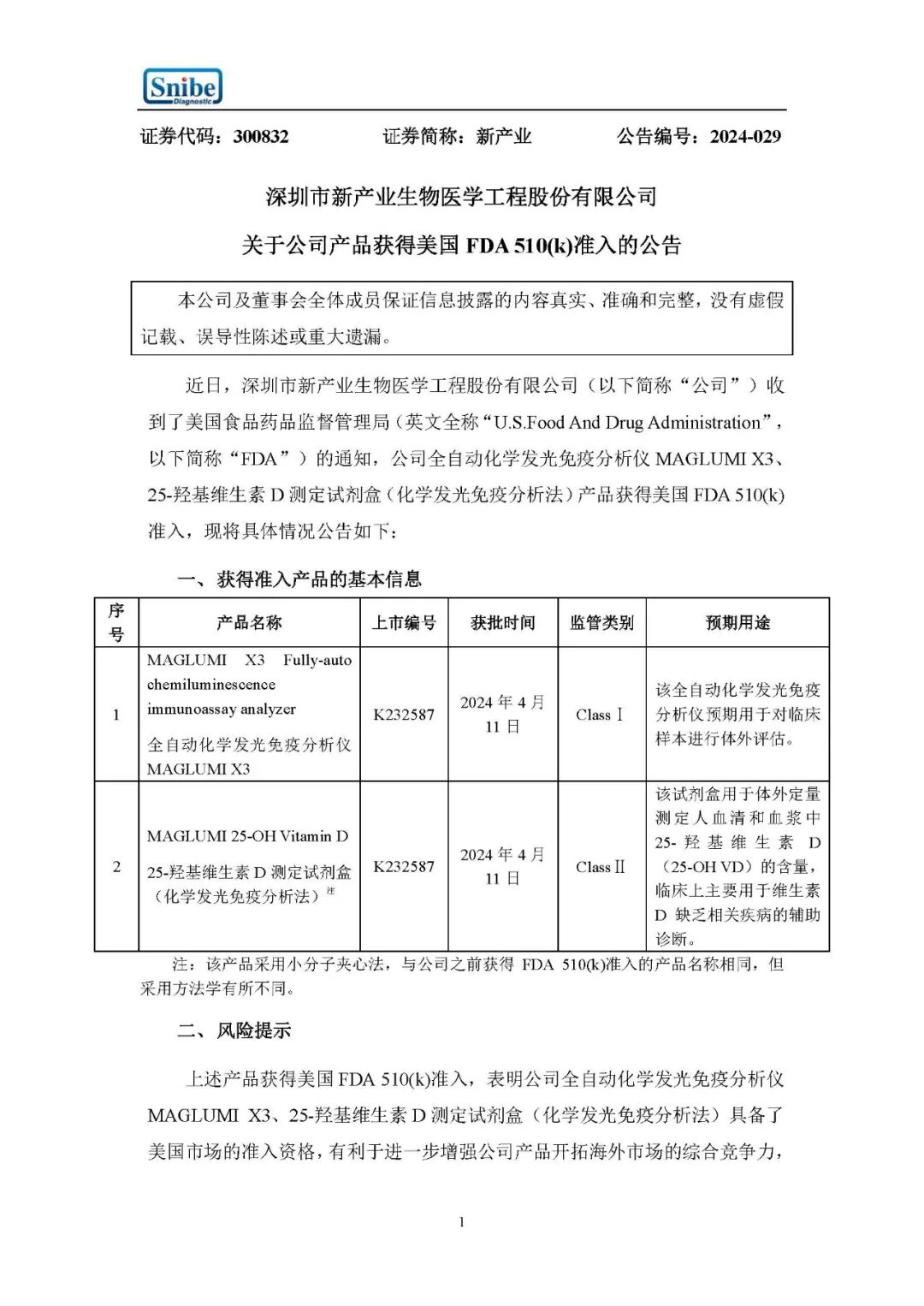 近日,新产业生物收到了美国食品药品监督管理局的通知,公司全自动化学发光免疫分析仪 MAGLUMI X3、25-羟基维生素D测定试剂盒(化学发光免疫分析法)产品获得美国 FDA 510(k) 准入。