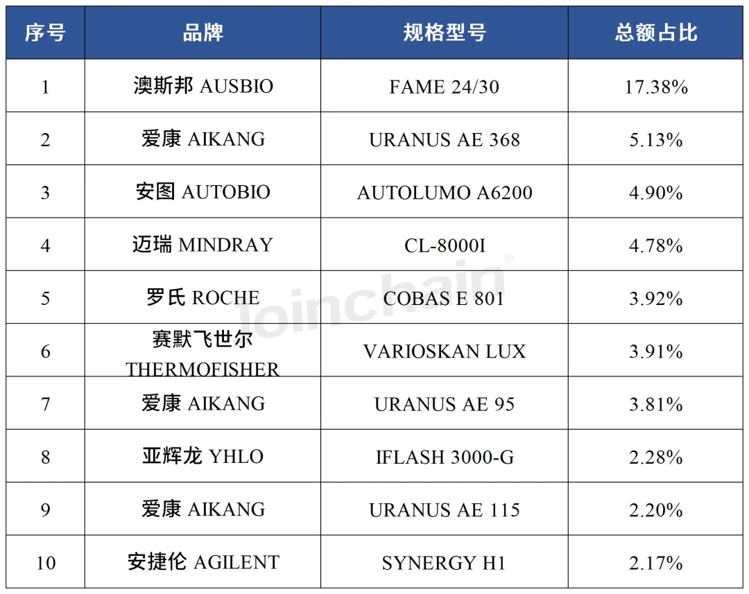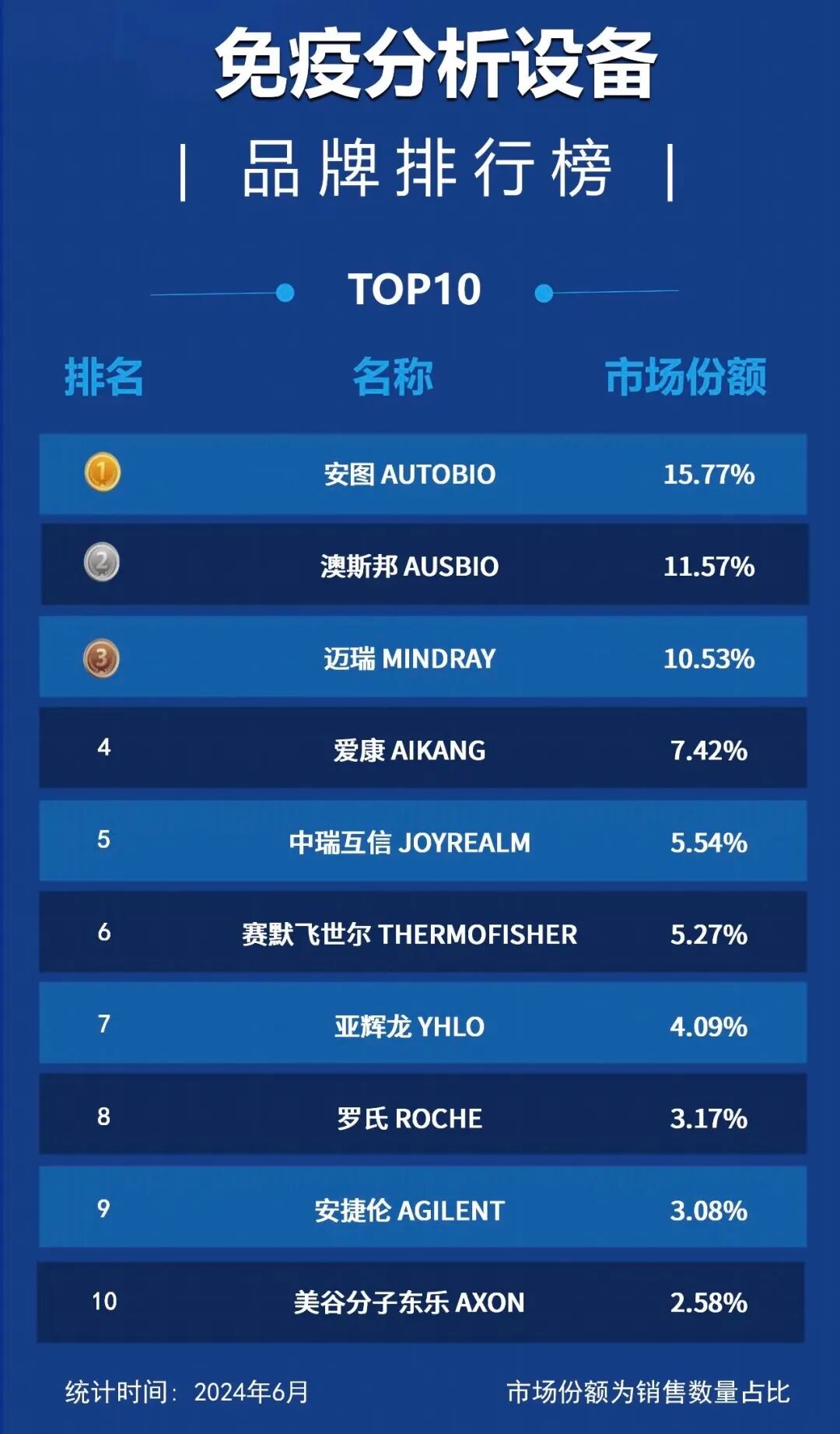 统计6月免疫分析设备品牌中标情况(Top10)如下: