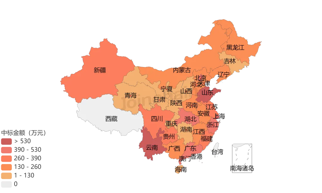 根据中标结果,2024年6月免疫分析设备招标较活跃的地区主要在山东省,采购金额占比为13.82%,云南省排在第二,金额占比为8.91%,上海市为第三位,金额占比为8.51%。