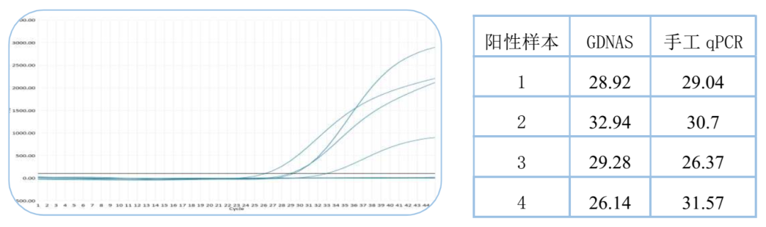 12个临床收集的粪便样本,经GDNAS幽门螺杆菌核酸检测,阳性4例,阴性8例,扩增曲线如左图,阳性样本Ct值如右表。