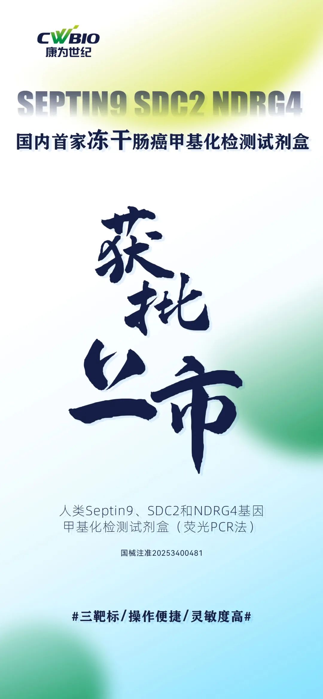 康为世纪(SH . 688426 )自主研发生产的人类Septin9、SDC2和NDRG4基因甲基化检测试剂盒(荧光PCR法)获国家药品监督管理局颁发的《医疗器械注册证》。这是我国冻干肠癌甲基化检测试剂盒第一张三类注册证,填补了行业空白。