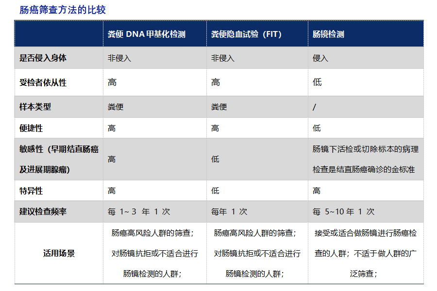 《中国早期结直肠癌筛查流程专家共识意见( 2019, 上海)》指出:粪便DNA检测主要针对结直肠脱落细胞的基因突变和(或)甲基化等特征,有单靶点和多靶点方案,也可与FIT联合检测,具有无需特殊设备、无需限制饮食、无创等优点,有望应用于人群普查,近年来成为研究的热点之一。