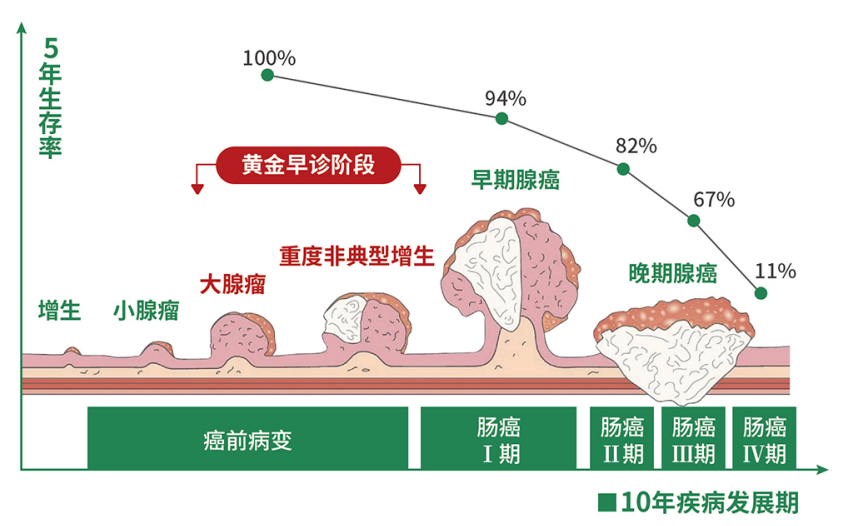 正常大肠黏膜从“增生➨腺瘤形成➨癌变”的过程,一般需要5~10年的时间,这为肠癌的早期诊断和干预提供了重要的时间窗口, 只要发现得早, 早期肠癌的治愈率高达90%,晚期癌则不足10%。