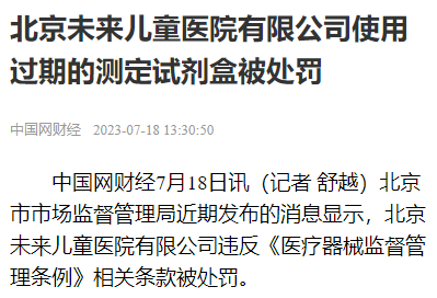 7月18日,中国网财经报道称,北京市市场监督管理局近期发布的消息显示,北京未来儿童医院有限公司检验科使用了共计金额1938元的两盒过期试剂盒。北京市石景山区市场监督管理局责令北京未来儿童医院有限公司改正上述违法行为,并决定罚款29000元,没收非法财物。
