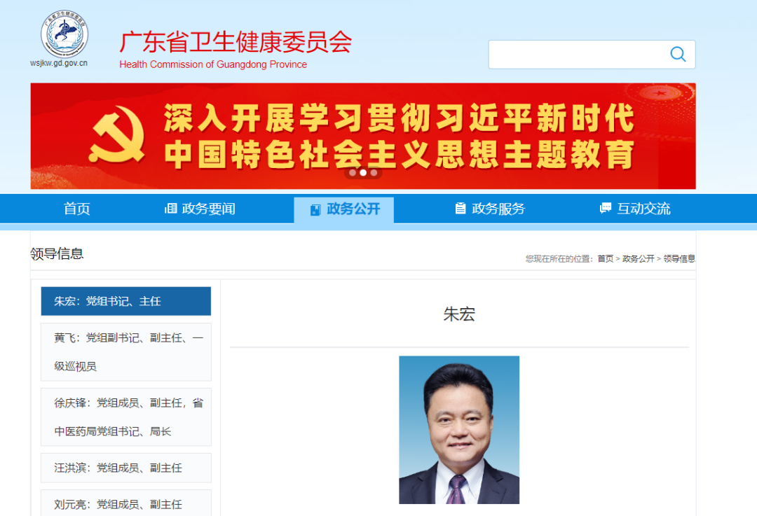 在广东省卫健委官网领导信息一栏,朱宏、徐庆锋的简历依然显示在主要位置。