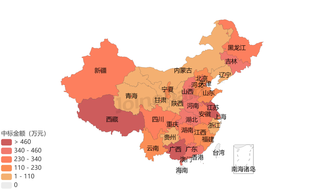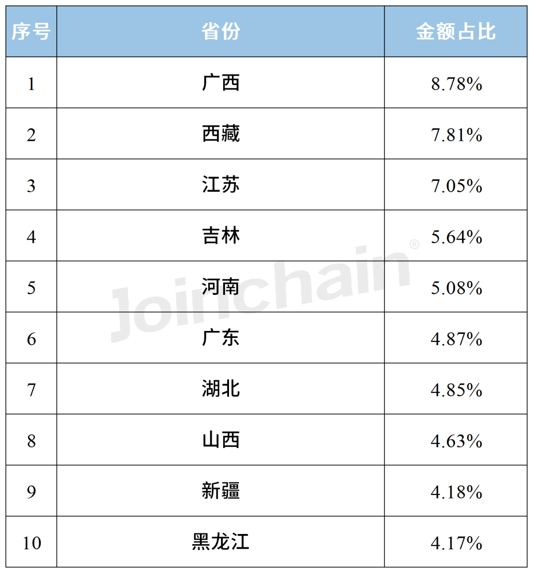 从型号上观察,2024年5月份,迈瑞型号为BS-2800M的生化分析仪排名第一,其中标总额占比为19.06%;位居第二的是贝克曼的AU5800,中标总额占比为16.65%;第三还是来自迈瑞,型号为BS-830,中标总额占比为10.95%。图表2 2024年5月生化分析仪品牌型号中标情况(Top10)根据中标结果,2024年5月生化分析仪招标较活跃的地区主要在广西壮族自治区,采购金额占比为8.78%,西藏自治区排在第二,金额占比为7.81%,江苏省为第三位,金额占比为7.05%。图表3 2024年5月各省(自治区、直辖市)生化分析仪中标金额(单位:万元)图表4 2024年5月各省(自治区、直辖市)生化分析仪中标情况详情(TOP10)