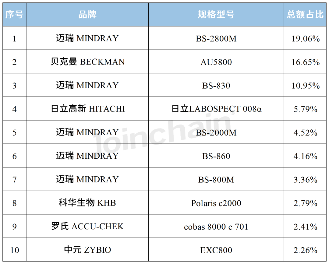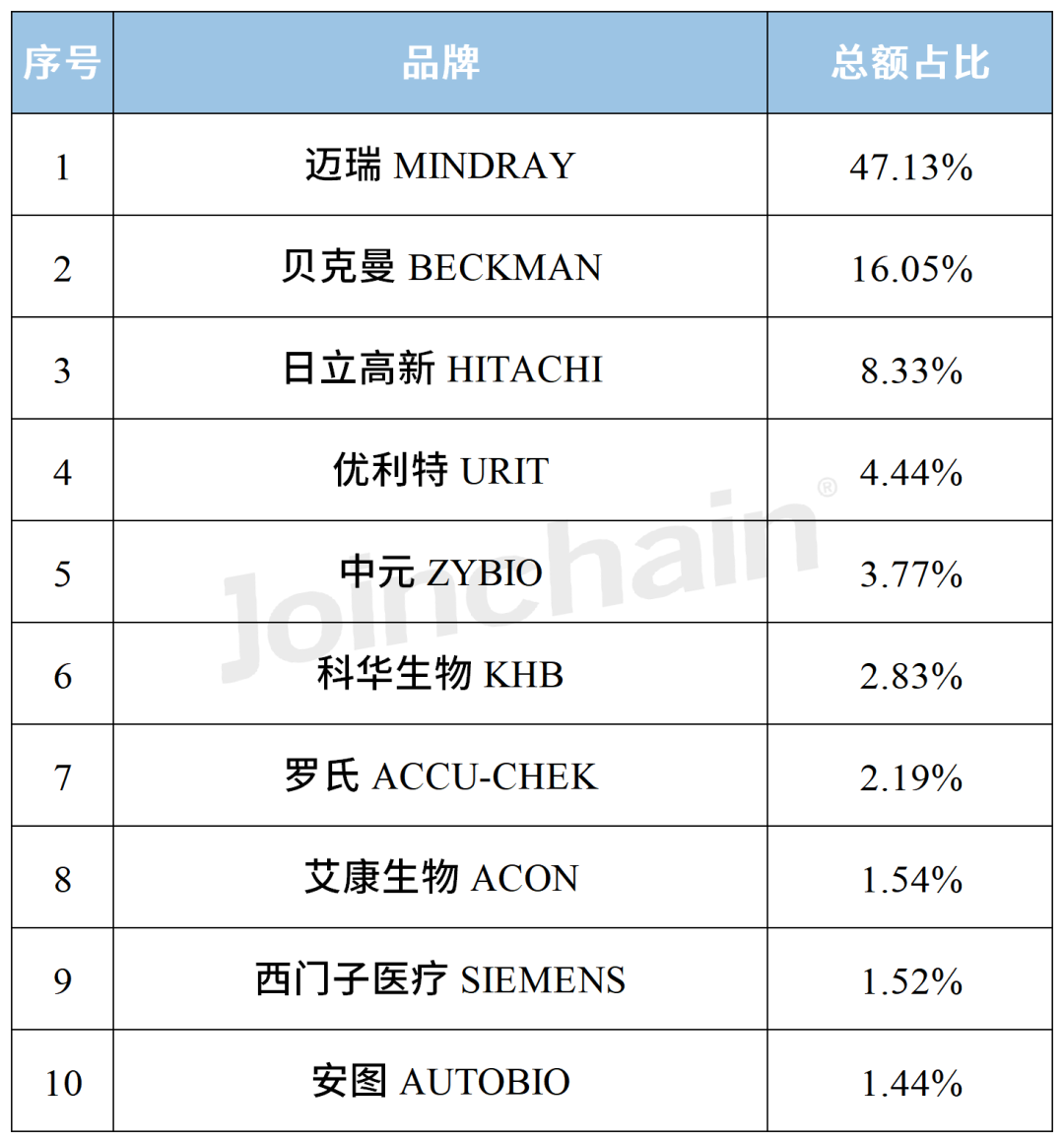 图表1 2024年5月生化分析仪品牌中标情况(Top10)