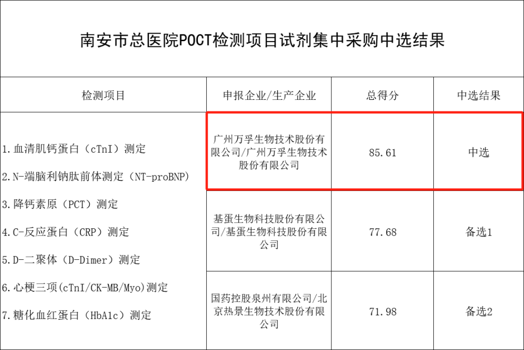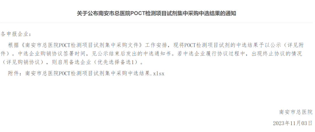 11月3日,南安市总医院POCT检测项目试剂集中采购中选结果公布,