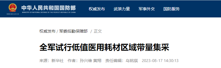 2023年8月17日,中华人民共和国国防部网站发布了《全军试行低值医用耗材区域带量集采》,指出经过近2年试点实践,中央军委后勤保障部印发通知,从今年7月起,在全军医疗机构、药材供应机构试行低值医用耗材区域带量集中采购。