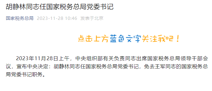 据国家税务总局28日消息,2023年11月28日上午,中央组织部有关负责同志出席国家税务总局领导干部会议,宣布中央决定:胡静林同志任国家税务总局党委书记,免去王军同志的国家税务总局党委书记职务。