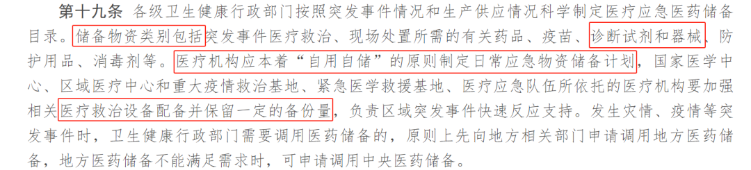 通知明确,各级卫生健康行政部门按照突发事件情况和生产供应情况科学制定医疗应急医药储备目录。储备物资类别包括突发事件医疗救治、现场处置所需的有关药品、疫苗、诊断试剂和器械、防护用品、消毒剂等。医疗机构应本着“自用自储”的原则制定日常应急物资储备计划,国家医学中心、区域医疗中心和重大疫情救治基地、紧急医学救援基地、医疗应急队伍所依托的医疗机构要加强相关医疗救治设备配备并保留一定的备份量。