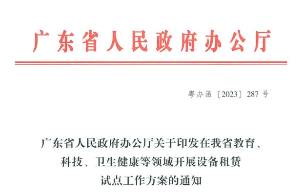 2023年,广东省政府发布《在我省教育科技、卫生健康等领域开展设备租赁试点工作方案的通知》,并且同步下发了《关于在我省教育领域开展设备租赁试点的工作方案》。