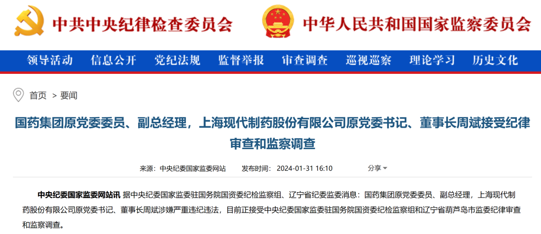 1月31日,据中央纪委国家监委网站消息,国药集团原党委委员、副总经理,