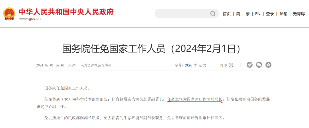 2月1日,中国政府网发布国务院任免国家工作人员消息,任命章轲为国家医疗保障局局长。