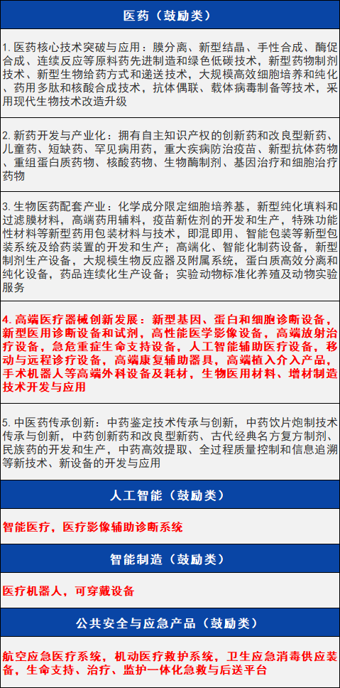 新版目录公布了多项医药(械)产业鼓励类目,其中高端医疗器械创新发展领域被重点鼓励的项目有: