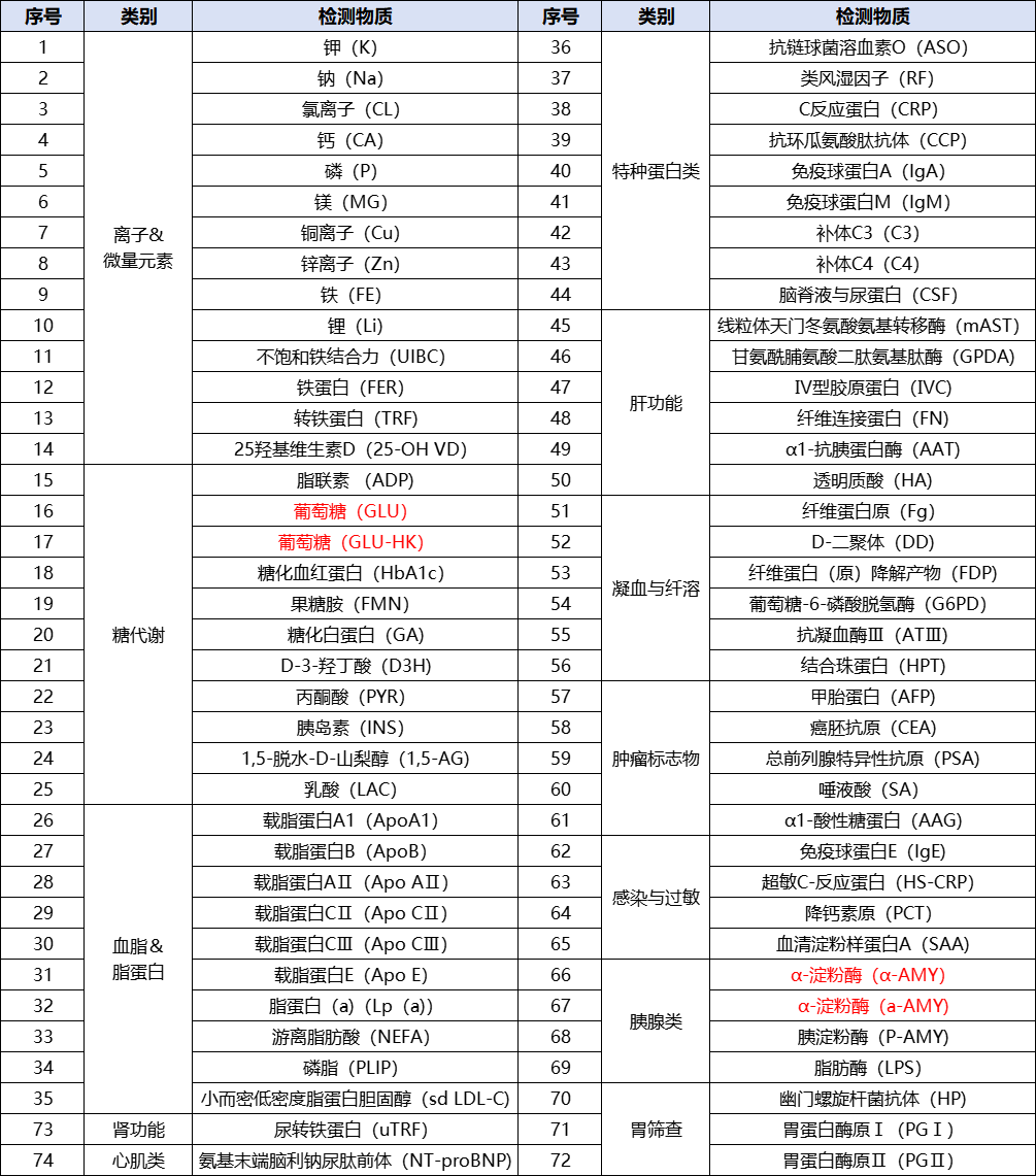 通过分析可以看出,74个项目,12个类别涵盖了离子/微量元素、糖代谢、血脂、特种蛋白、肝功能、凝血与纤溶、肿瘤标志物、感染与过敏、胰腺类、胃筛查、肾功、心肌类。