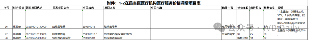 体外诊断调增项目相对比较简单,都是结核相关项目,结核菌培养及药敏实验均涨价100%!