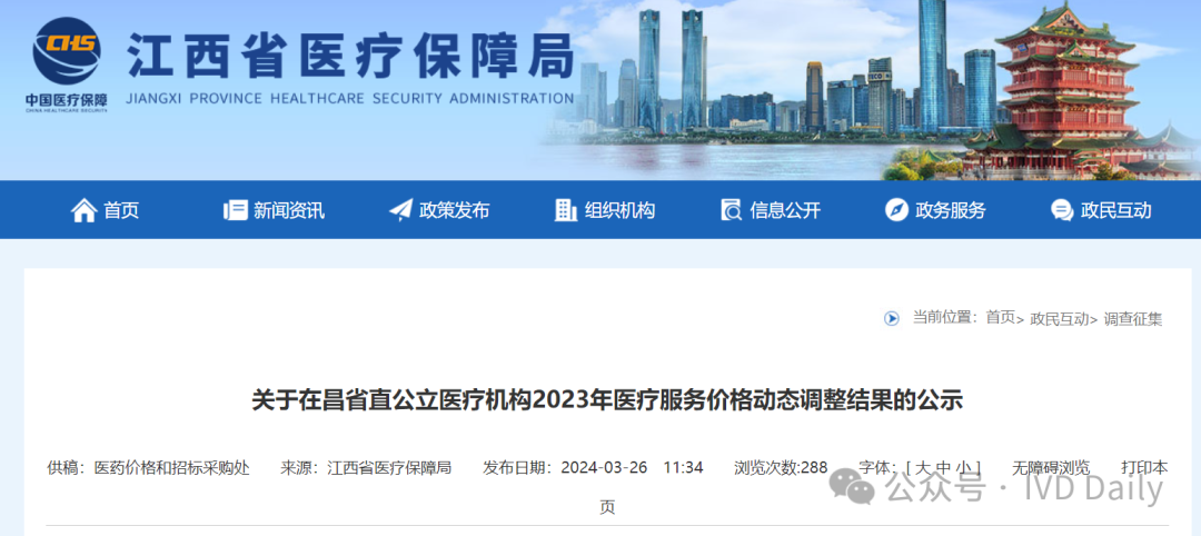 根据《江西省医疗保障局 江西省卫生健康委员会 江西省财政厅 江西省市场监督管理局印发<关于建立医疗服务价格动态调整机制的实施意见(试行)>的通知》(赣医保字〔2022〕22号)和《关于反馈江西省医保局2023年医疗服务价格动态调整情况报告的复函》(医保价采函〔2024〕9号)要求,为进一步理顺医疗服务价格比价关系,根据评估结果并履行相关程序,决定公布实施在昌省直医疗机构2023年医疗服务价格动态调整结果。现就有关事项通知如下: