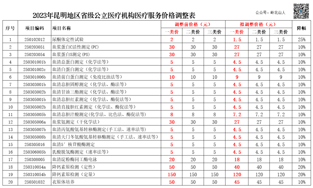 此次,调整523项昆明地区省级公立医疗机构医疗服务价格。其中,降低20项检验类项目价格;提高503项体现技术劳务价值的手术、治疗、护理、中医等项目价格(具体项目价格见附件)。